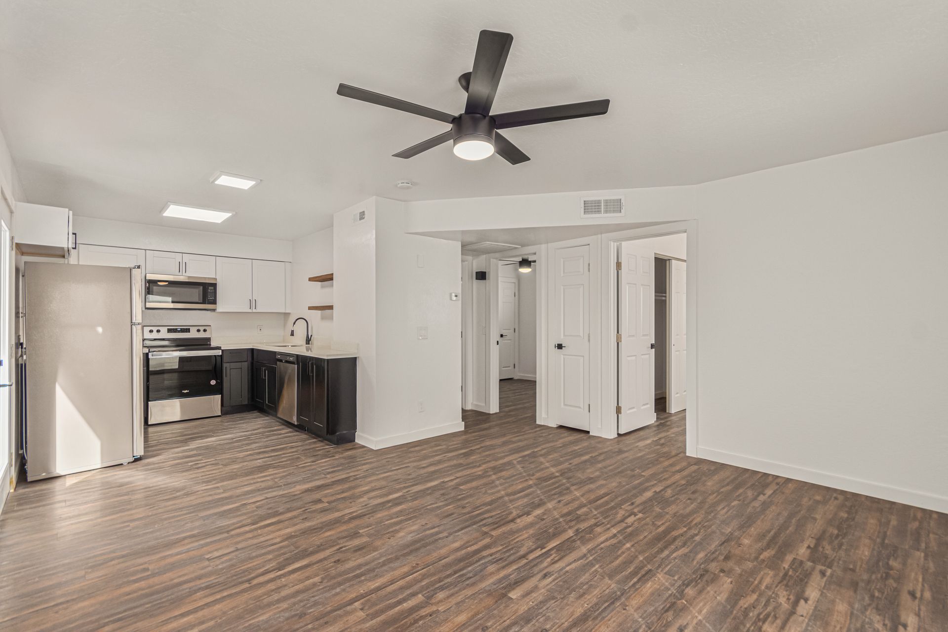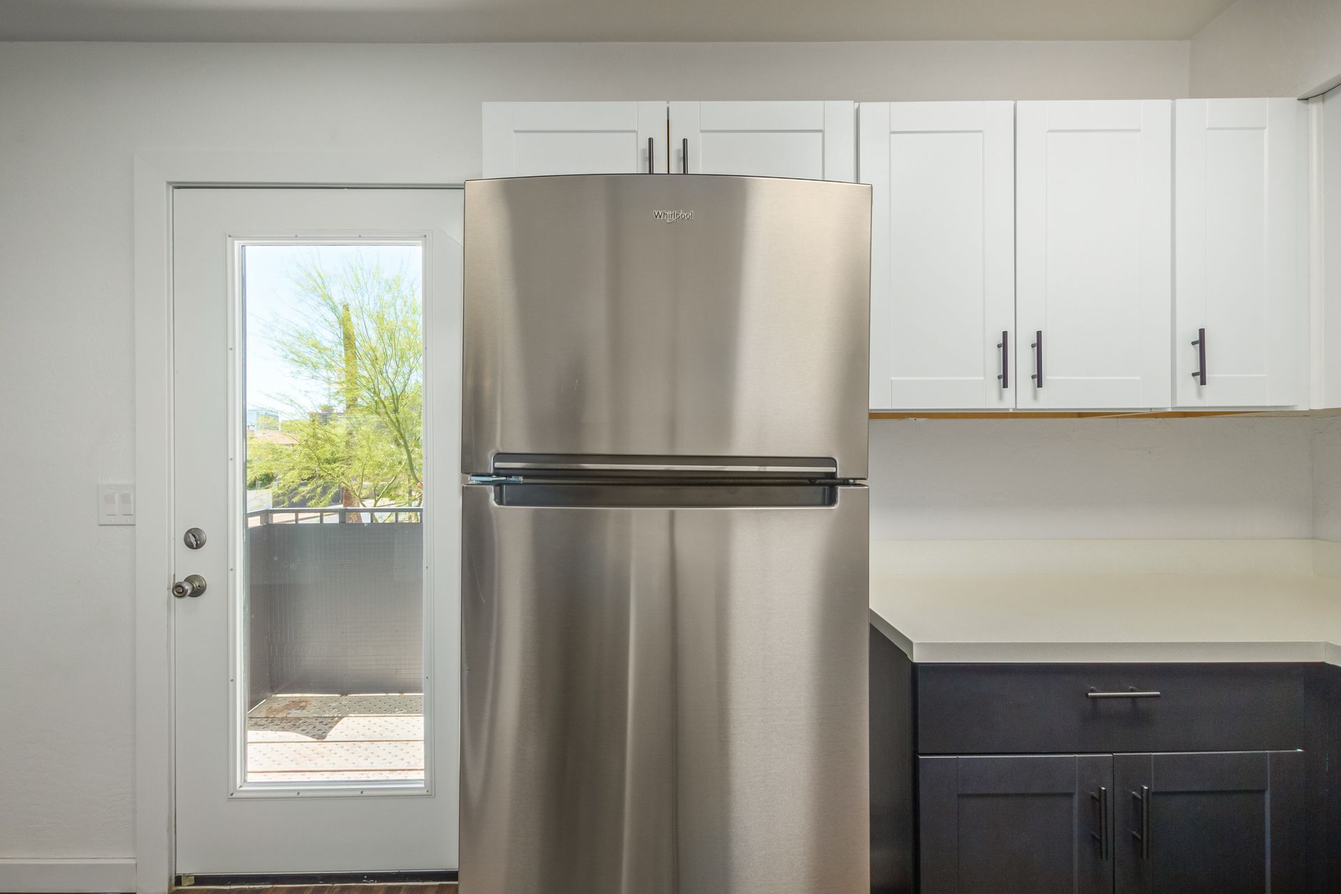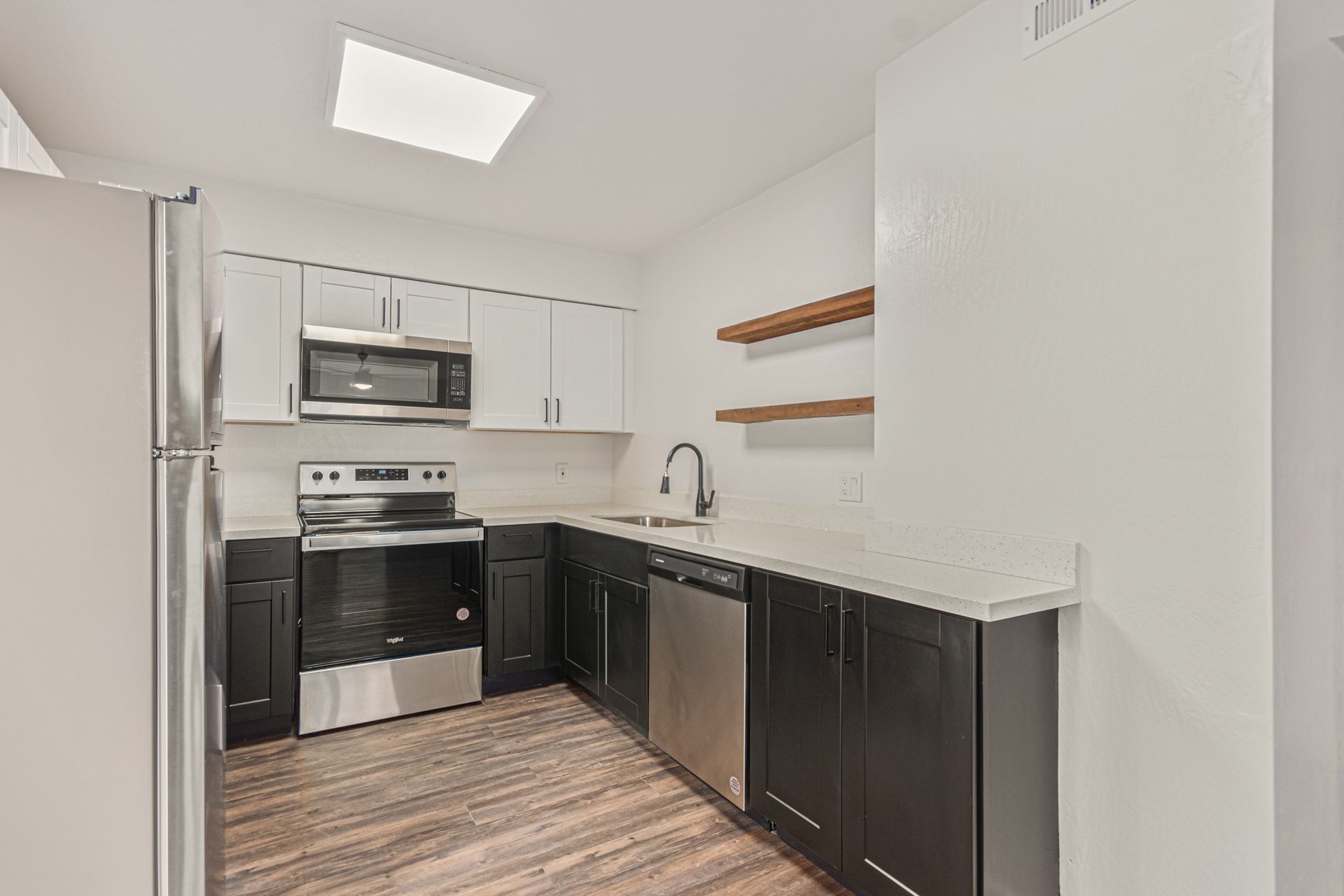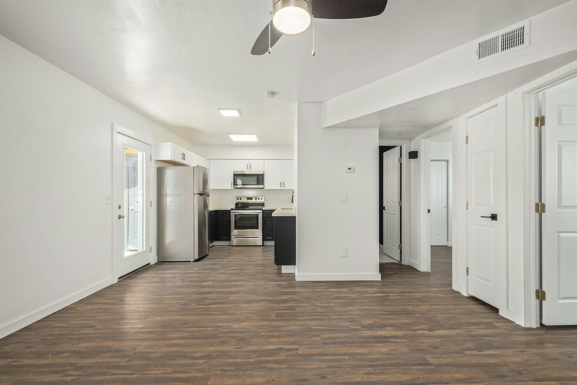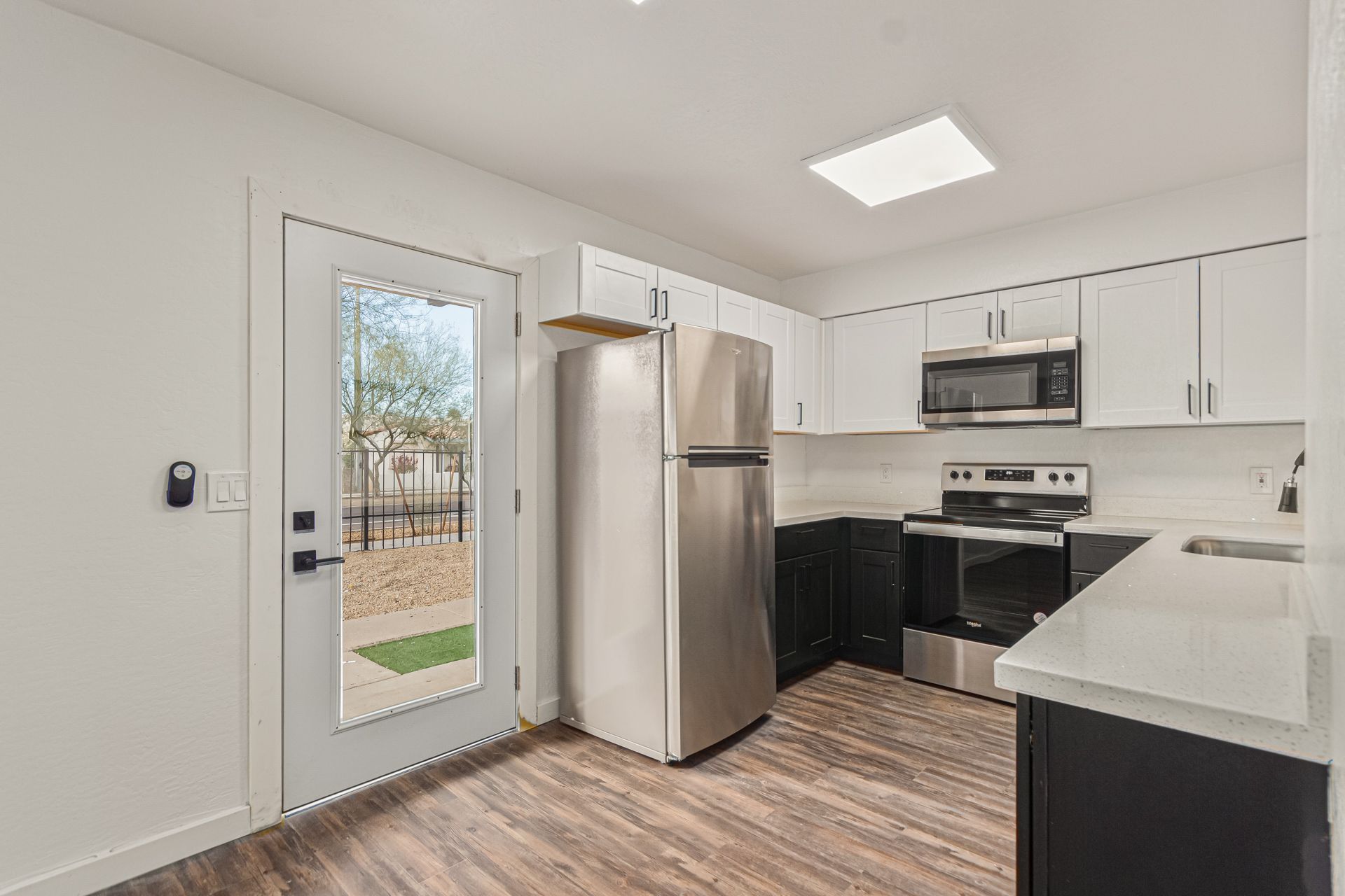 Step inside to discover a thoughtfully designed interior featuring sleek stainless steel appliances, crisp white cabinetry, and elegant new light fixtures that elevate the kitchen’s aesthetic. The open layout is complemented by fresh paint throughout, creating a bright, welcoming atmosphere.